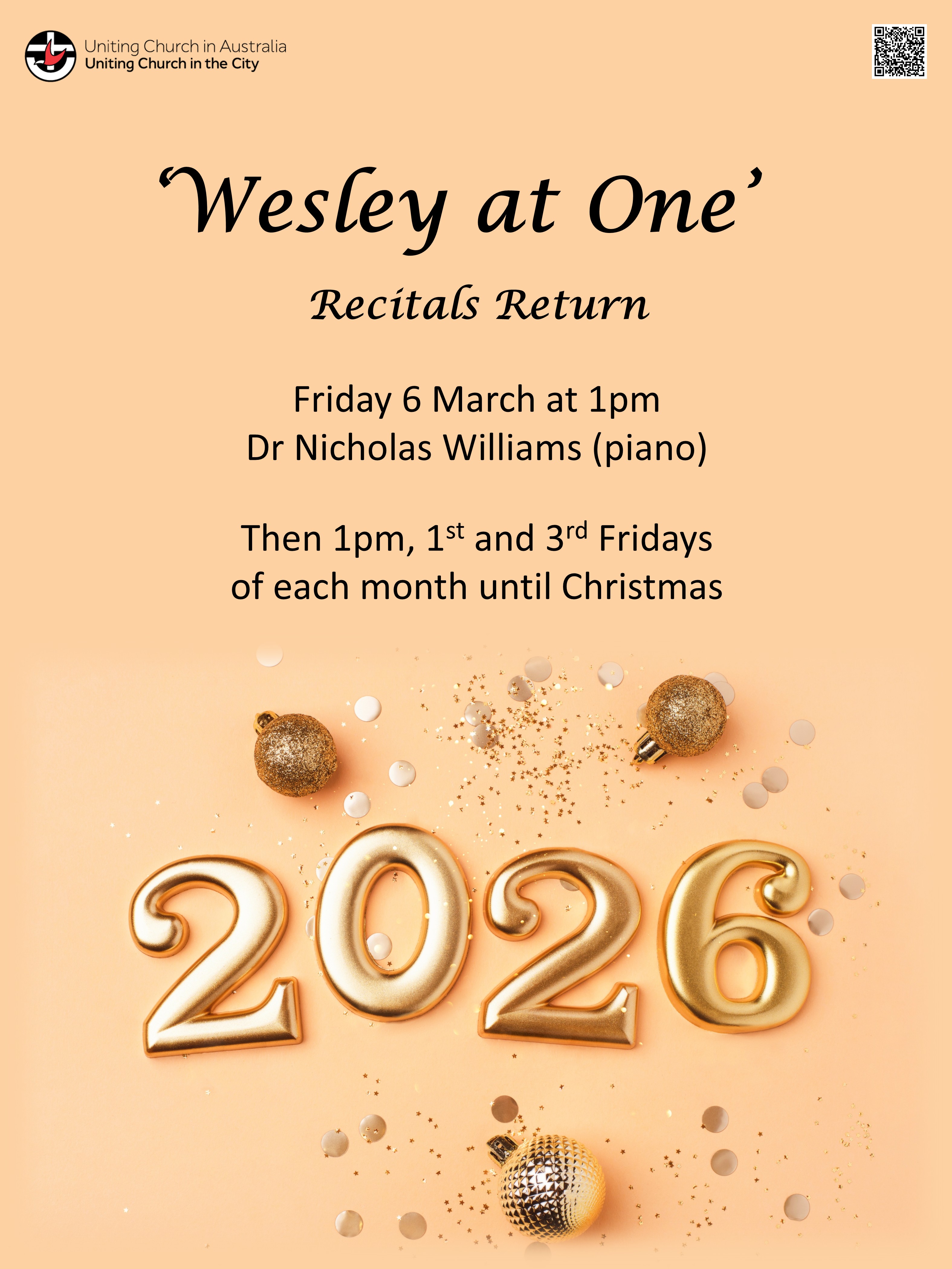 Date: Mar, Friday 6th 1:00 PM - Mar, Friday 6th 5:00 PMWe look forward to welcoming you back to our first Wesley at One recital from 1pm on Friday 6 March, 2026 featuring beautiul music from Dr Nicholas Williams (piano).