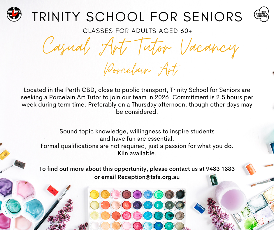 For more information on how you can get involved contact Trinity School for Seniors by telephone (08) 9483 1333 or email Reception@tsfs.org.au.