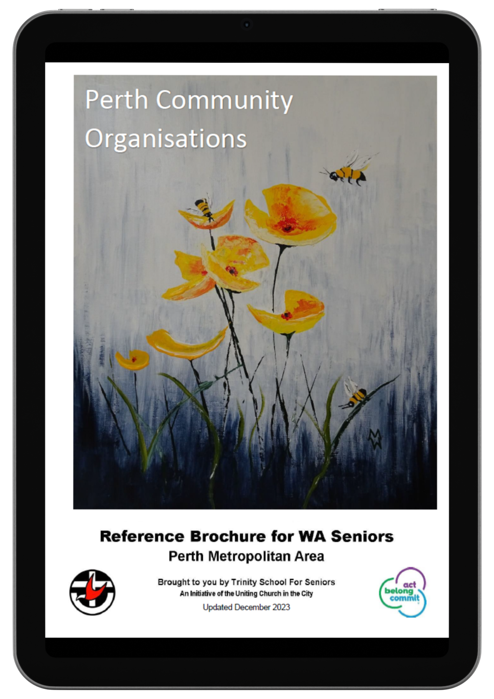Introducing our "Reference Brochure for WA Seniors"This brochure has been produced by Trinity School for Seniors with WA senior citizens in mind. It aims to help seniors find and access specific information relating to their age group within the Perth Metropolitan Area. Our focus is to help our members stay connected to useful services on offer within the Perth Metropolitan Area. This brochure originally existed as a folder on the Trinity School for Seniors’ Reception desk to assist our members to find activities and placement in organisations when demand for TSFS classes heavily exceeded supply. Over the years this folder grew to include contact information for various other services and support agencies relevant to our members’ needs. We have published this brochure as a condensed yet comprehensive version that we can now distribute amongst our members so they can keep this useful reference brochure on hand for whenever they are in need. Resources listed in this brochure relate to: We hope this brochure assists WA seniors with connecting to helpful support resources and keeping active in their community. Click here to download your copy! Alternatively, collect a print copy from Trinity School for Seniors Reception. |